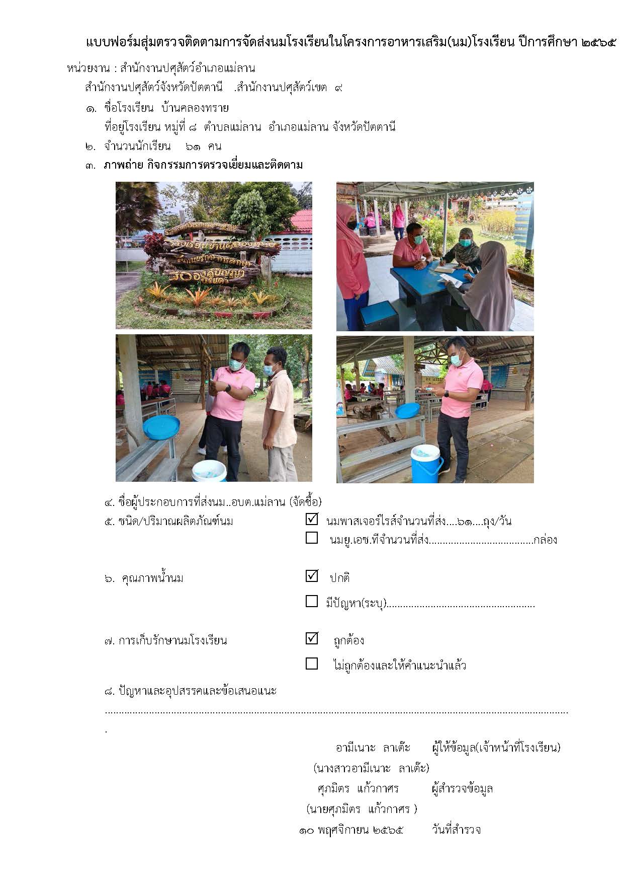 วันที่ 10 พฤศจิกายน 2565 นายศุภมิตร แก้วกาศร เจ้าพนักงานสัตวบาลชำนาญงาน รักษาราชการแทนปศุสัตว์อำเภอแม่ลาน พร้อมด้วย เจ้าหน้าที่ปศุสัตว์อำเภอแม่ลาน ลงพื้นที่ในการตรวจเยี่ยม ติดตาม และแจ้งผู้ประกอบการ้านจำหน่ายอาหารสัตว์ควบคุมเฉพาะ พร้อมนำใบแจ้งชำระค่าธรรมเนียมรายปี เพื่อดำเนินการต่ออายุใบอนุญาตขายอาหารสัตว์ควบคุมจเฉพาะ ประจำปี 2566 แก่ร้านจำหน่ายอาหารสัตว์ควยคุมเฉพาะ ในพื้นที่อำเภอแม่ลาน จังหวัดปัตตานี จำนวน 7 ร้าน
