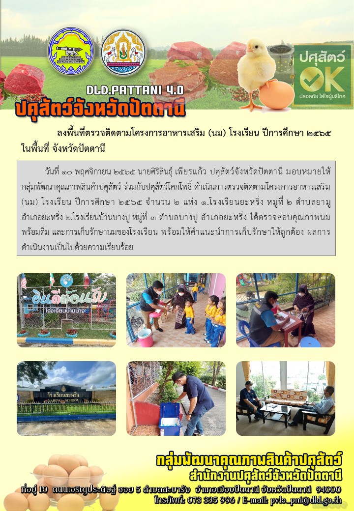 วันที่ 10 พฤศจิกายน 2565 เวลา 10.00 น. นายนพรัตน์ ไชยยงค์ เจ้าพนักงานสัตวบาลชำนาญงาน รักษาราชการแทนปศุสัตว์อำเภอยะหริ่ง มอบหมายให้ นายยาหายา บากา เจ้าหน้าที่ช่วยงานสัตวบาล ผสมเทียม ขับเคลื่อนงานรณรงค์ฉีดวัคซีนป้องกันโรครปากและเท้าเปื่อย และลัมปีสกิน(LSD) ในโค-กระบือ ในพื้นที่เสี่ยง และให้คำแนะนำดูแลสุขภาพสัตว์ พร้อมประชาสัมพันธ์ให้เกษตรกรเฝ้าระวังโรคระบาดสัตว์อื่นๆ ฉีดวัคซีนโค 27 ตัว ในพื้นที่หมู่ที่ 3 ต.ปิยามุมัง อ.ยะหริ่ง